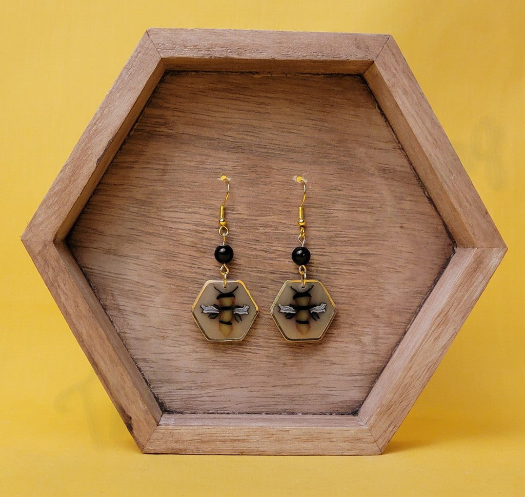 Handcrafted polymer clay bee, delicately encased in a gold-toned hexagon for a touch of elegance. Paired with a complementary handmade bead, this charming design adds a whimsical yet classy flair to any outfit. Finished with a gold-plated stainless steel ear hook for durability and shine—perfect for any occasion.