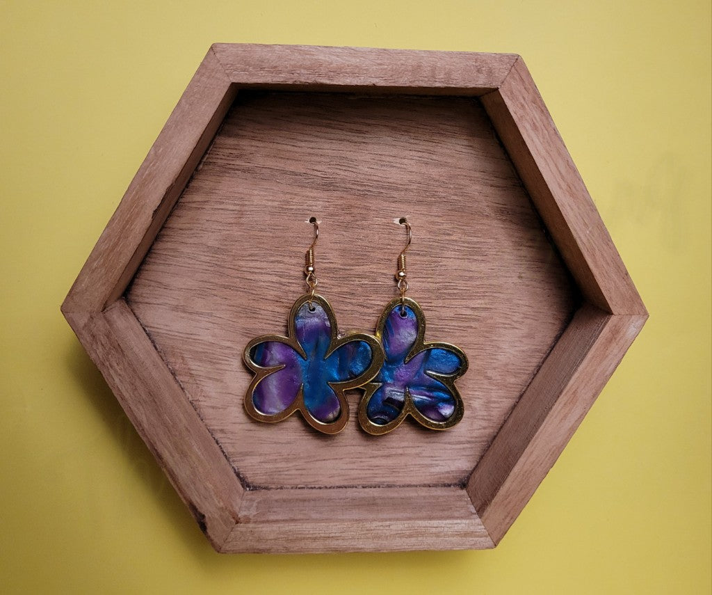 Handmade with polymer clay and UV resin. Hardware is stainless steel, hypo-allergenic and Nickel FREE. Flower overlay is brass