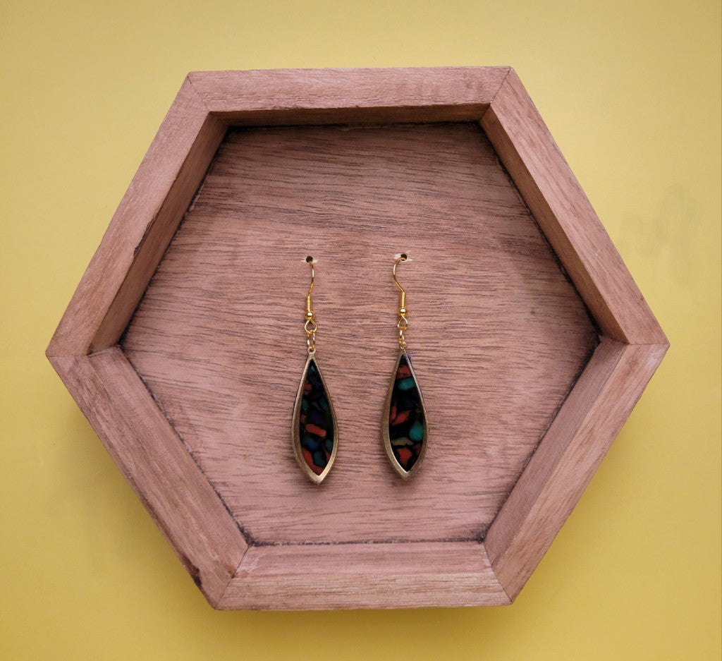 Handmade with polymer clay and UV resin. Hardware is stainless steel, hypo-allergenic and Nickel FREE. Oval overlay is brass.