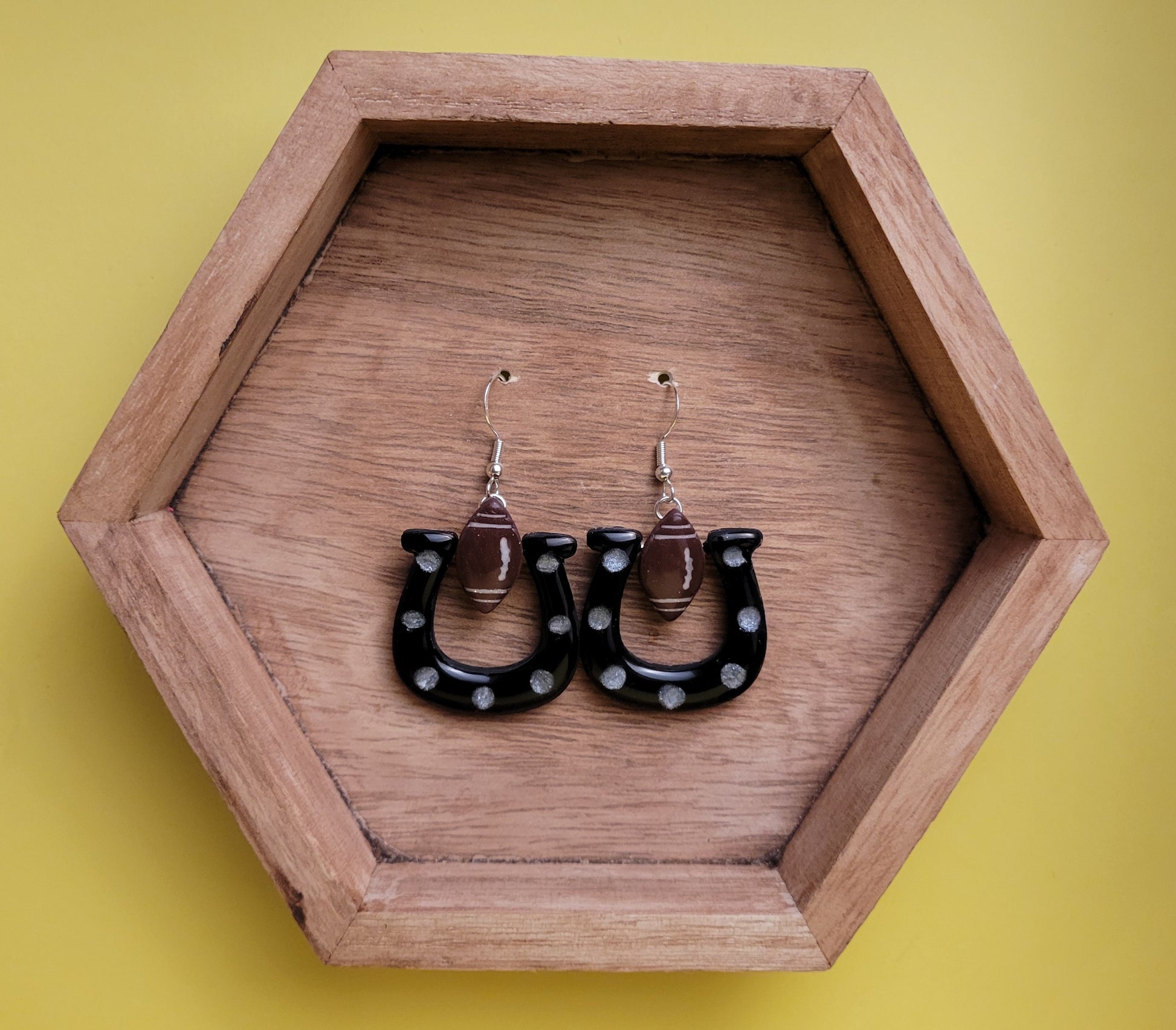 Get game day ready with these hand-made horseshoes! Measuring 2" from the lobe, these earrings are super light weight and ready to help you show off your team spirit!