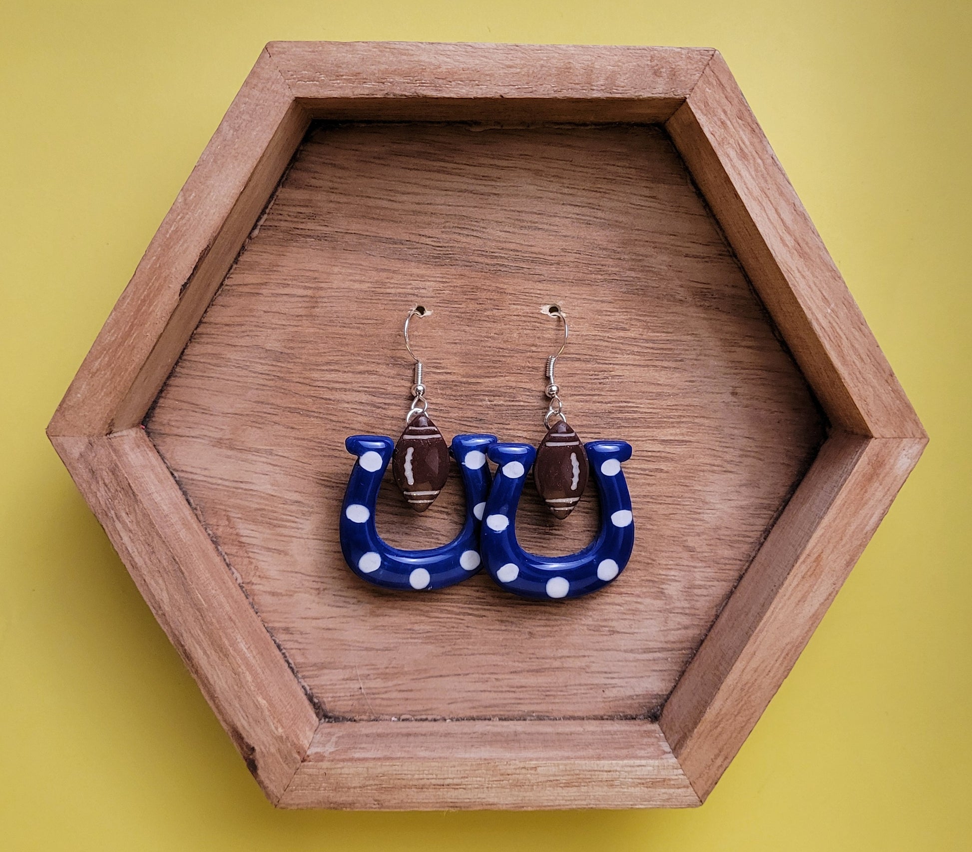 Get game day ready with these hand-made horseshoes! Measuring 2" from the lobe, these earrings are super light weight and ready to help you show off your team spirit!
