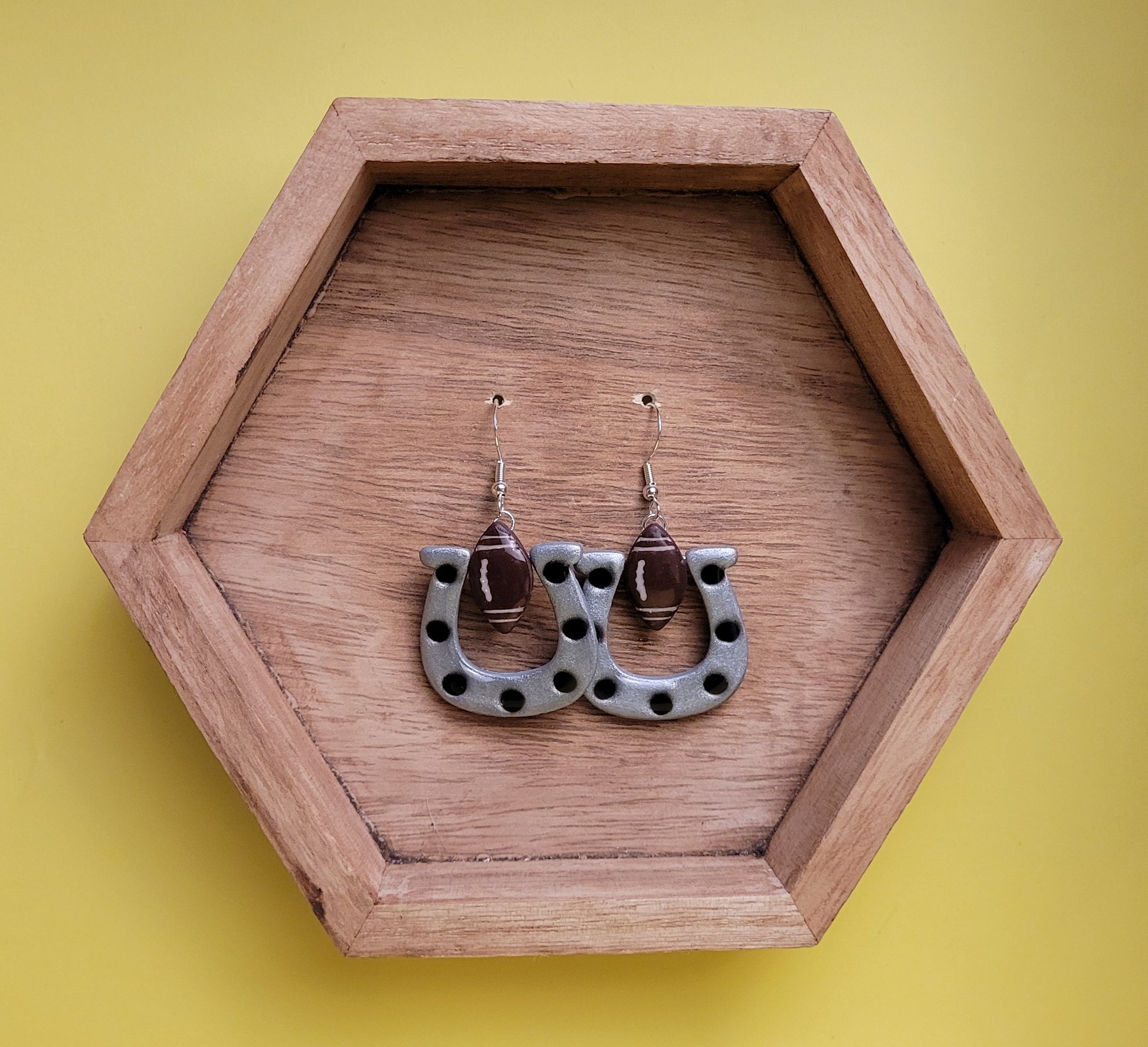 Get game day ready with these hand-made horseshoes! Measuring 2" from the lobe, these earrings are super light weight and ready to help you show off your team spirit!