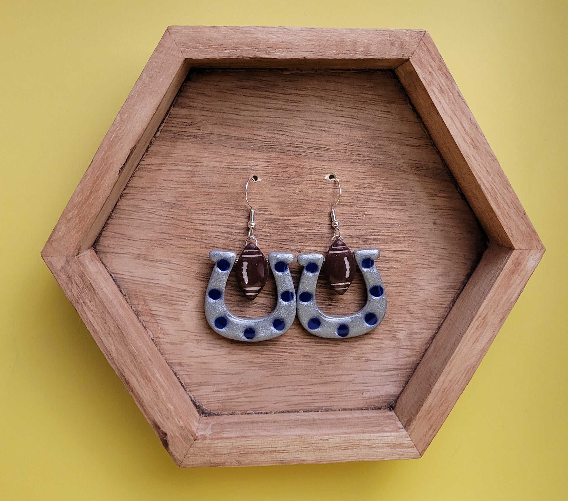 Get game day ready with these hand-made horseshoes! Measuring 2" from the lobe, these earrings are super light weight and ready to help you show off your team spirit!