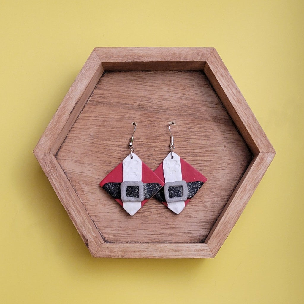 Santa Dangles These measure 2.5" from lobe to bottom of dangle. Hardware is stainless steel. Hypoallergenic and Nickel Free.