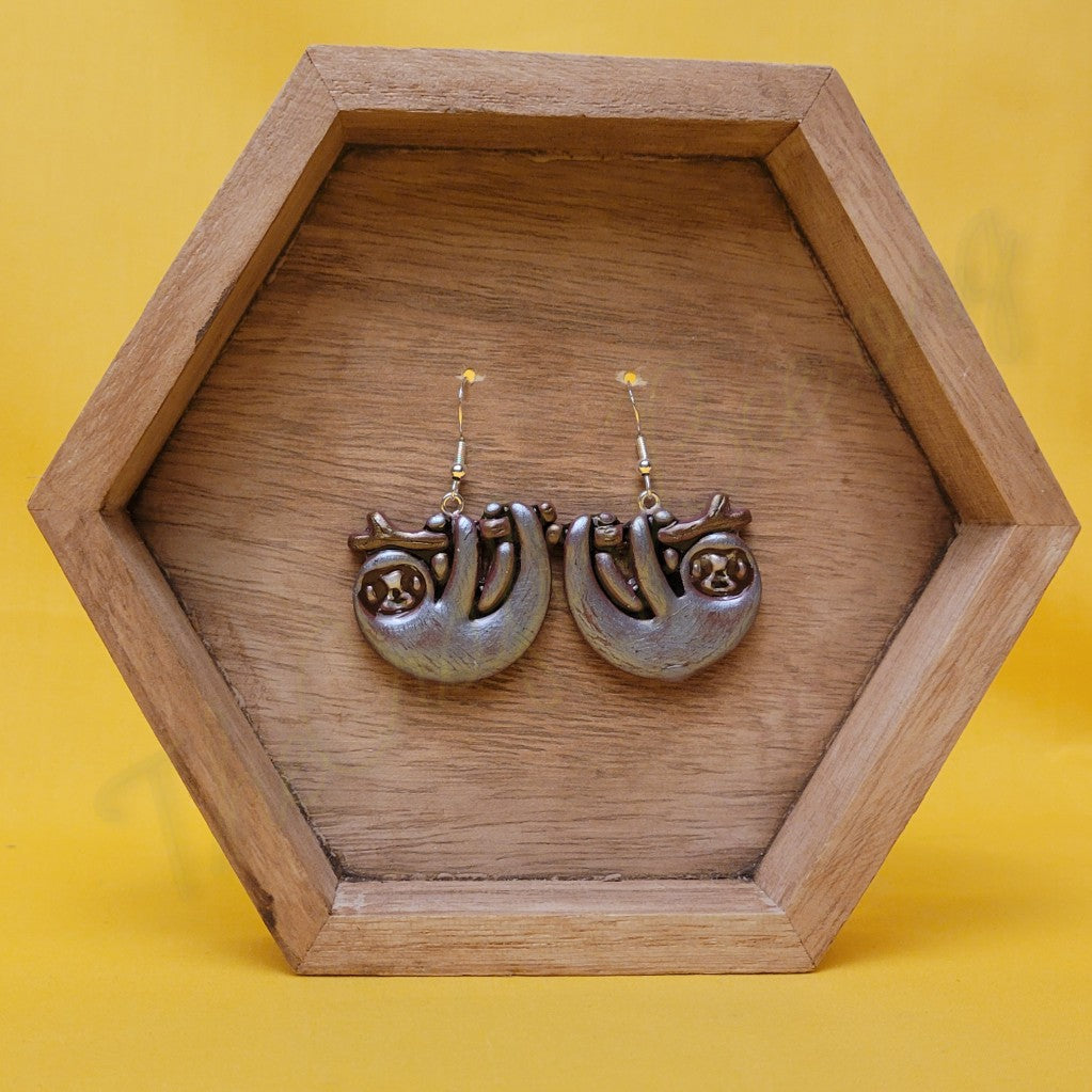 Sloth earrings are hand-painted accessories made from polymer clay, featuring unique, detailed designs of sloths. They come with silver ear hooks for a lightweight and stylish finish.