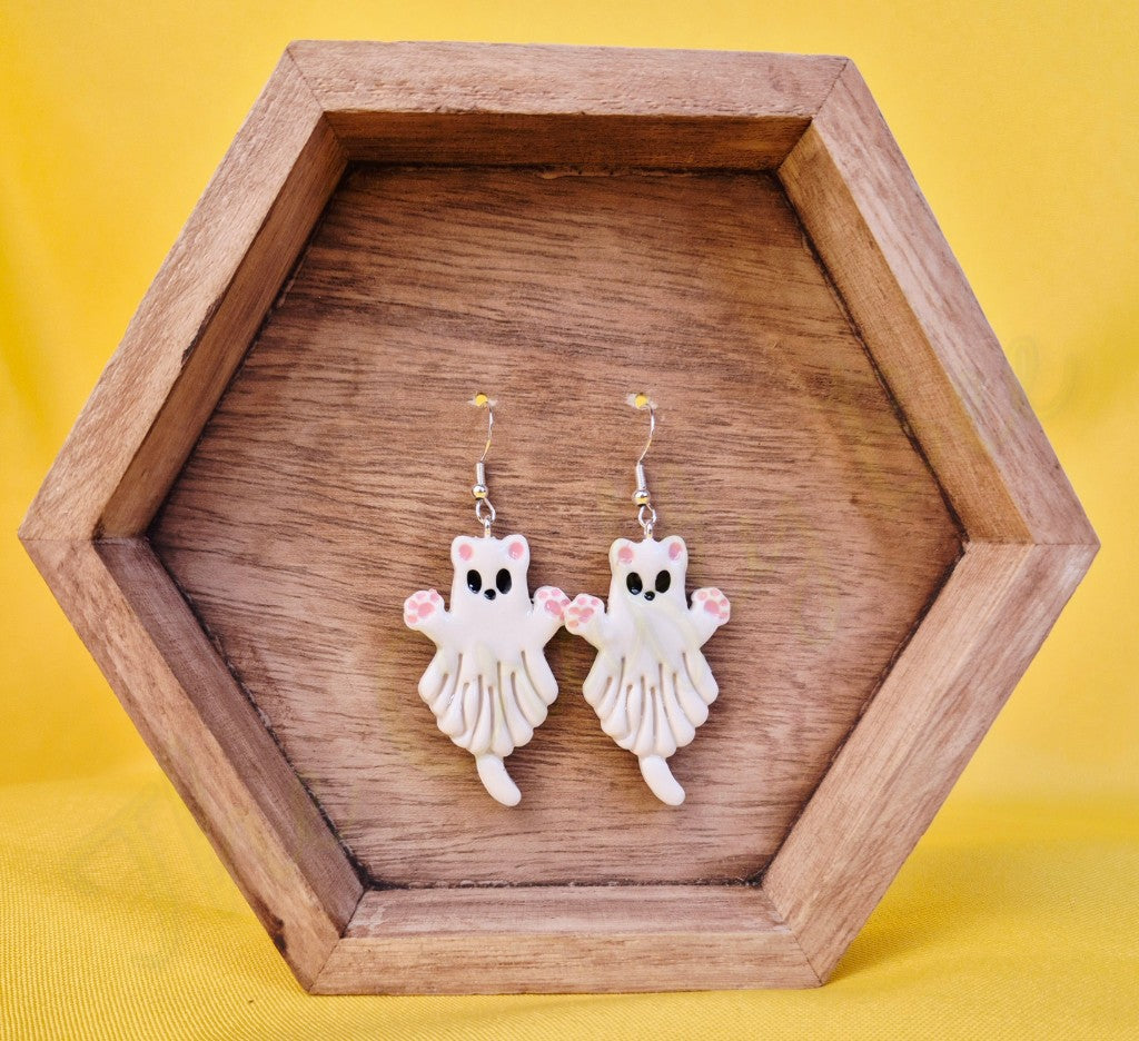 Transform your style with our Spooky Kitty earrings! Handmade with lightweight materials and finished with .925 silver earhooks. These adorable ghost kitties will add a touch of charm and playfulness to any outfit. Perfect for any cat or Halloween lover.