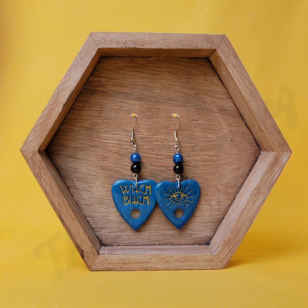 Add a touch of magic to your look with these Witch B!tch Planchette Earrings. Available in a variety of colors to suit your witchy vibes, each pair features a silver earhook for a sleek, mystical finish. Perfect for channeling your inner witch—whether you're casting spells or just making a statement.