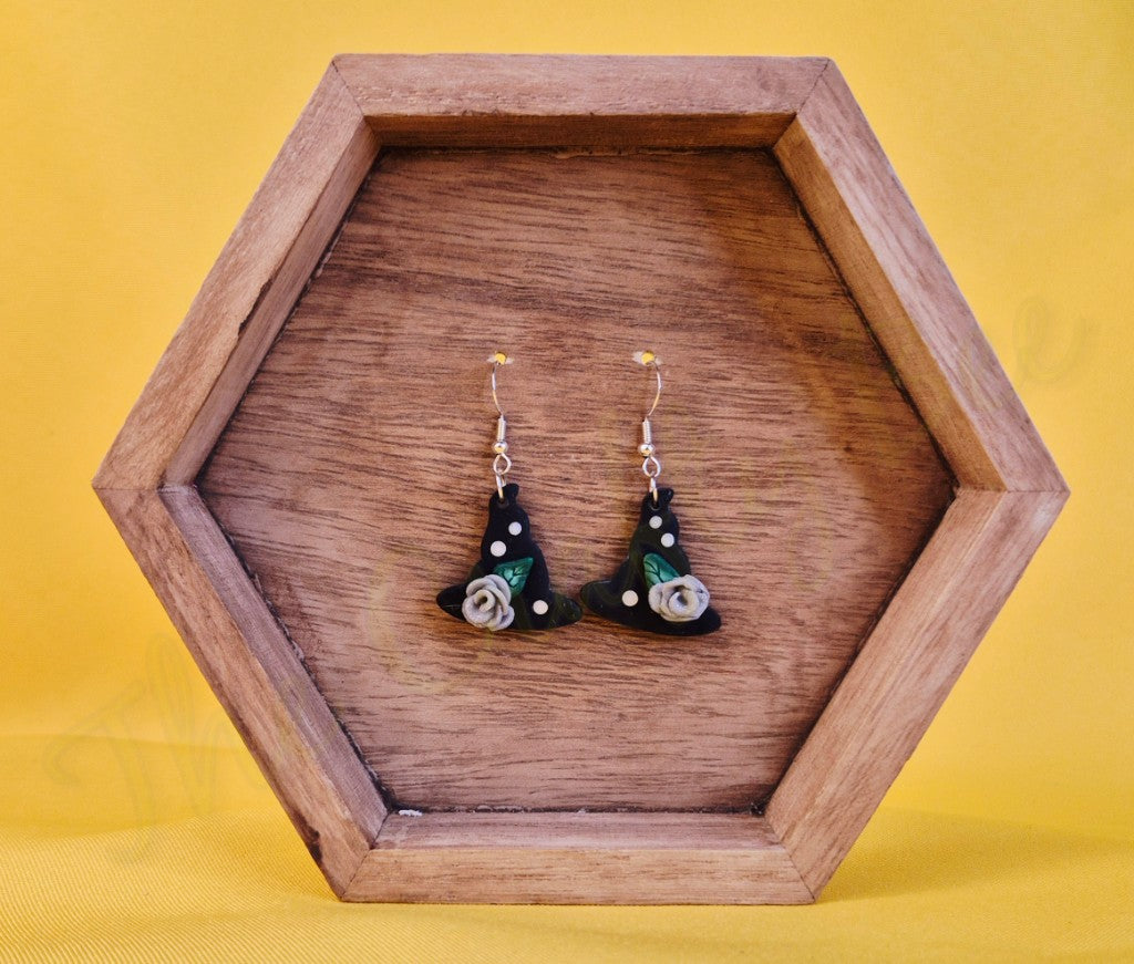 Add a touch of elegance to your Halloween costume with our Witch hat earrings. Handmade with lightweight and durable .925 silver earhooks, these earrings are adorned with a delicate rose for a subtle twist. Perfect for any witch or gothic look.