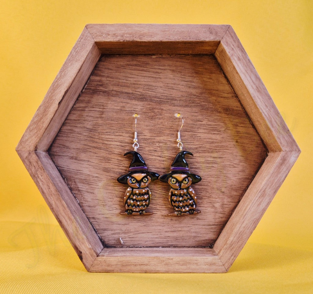 This handcrafted Witch Owl earrings features a whimsical owl adorned with a witch hat, perfect for Halloween or year-round. Each piece is meticulously painted and finished with 925 silver earhooks, providing a unique and lightweight accessory. Channel your love for owls and magic with this charming piece.